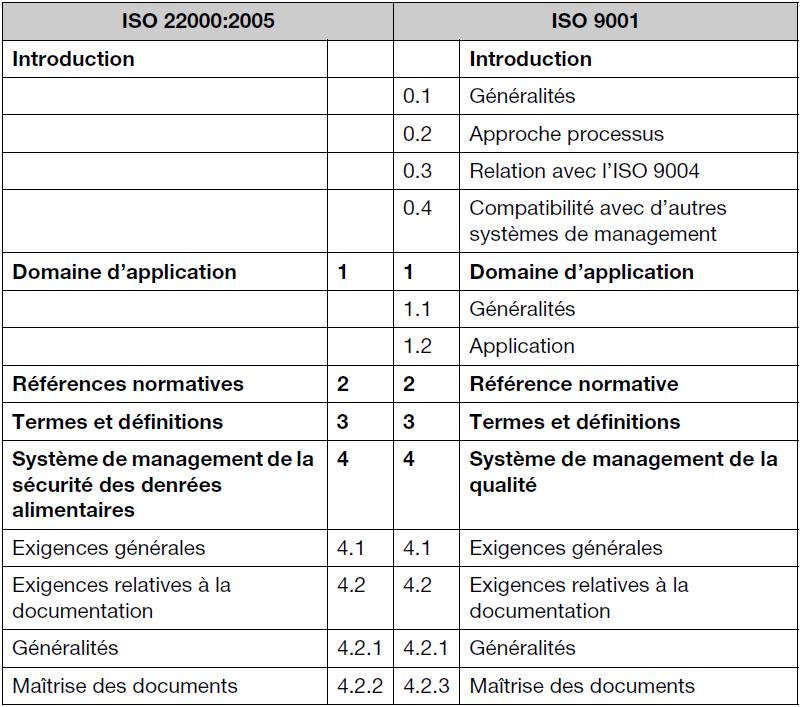 Tableau 2.6 Sommaires comparés des normes ISO 22000 et ISO 9001